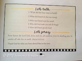After the story (which usually spans over about 1.5 - 2 pages) the next section would be the "discussion and prayer" section. This is where both Dumpling and I would sometimes have fairly long discussions over the story, what happened and where God is in the story / where God is in our everyday lives and how we should glorify him.